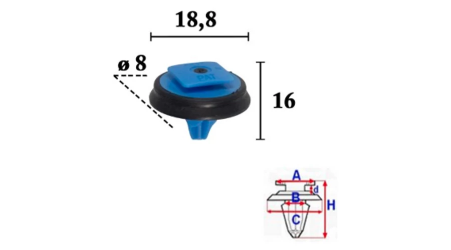 Méretek: A 11,5 mm, B 8 mm, C 18,8 mm, H 16 mm, ø 8-as furathoz
