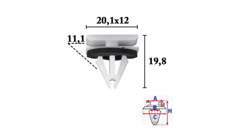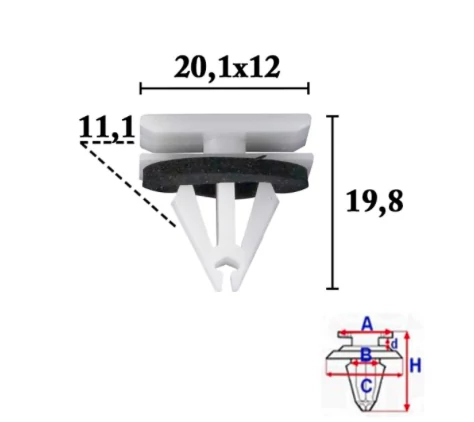 Méretek: A 19,8x12,1 mm, B 11,1 mm, C 20,1x12 mm, d 2,9 mm, H 19,8 mm