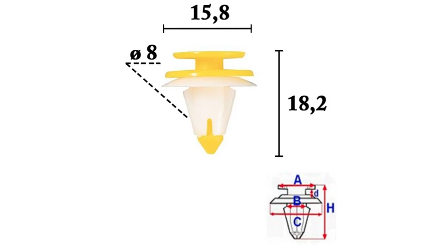 Méretek: A 12,9 mm B 7,8 mm C 15,8 mm d 2,4 mm H 18,2 mm és ø 8 mm furathoz