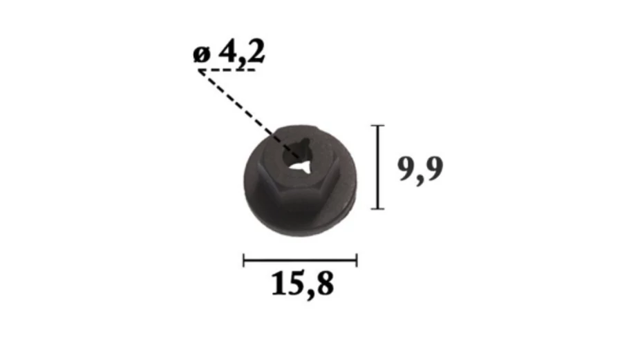Méretek: belső átmérő 4,2 mm, külső átmérő 15,8 mm, magasság 9,9 mm