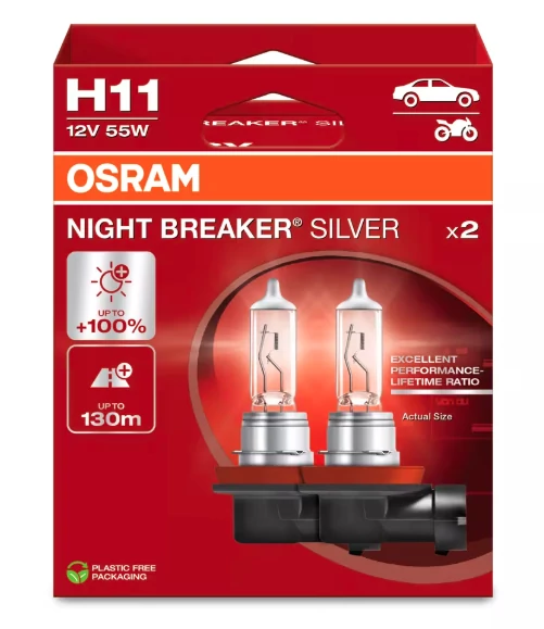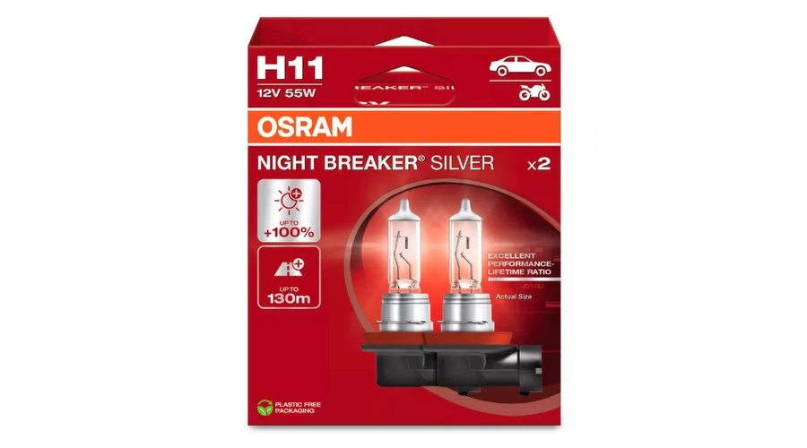 Az OSRAM NIGHT BREAKER SILVER akár 100%-kal nagyobb fényerőt generál a minimális törvényi szabványhoz képest, és akár 130 méter hosszú fénycsóvát is biztosít.