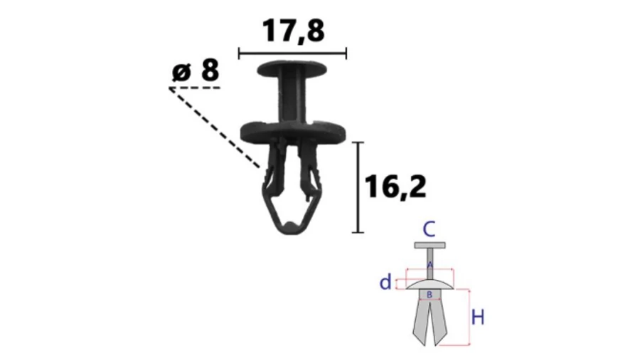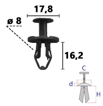 Méretek: A 17,8 mm, B 8 mm, C 11,9 mm, d 2,1 mm, M 16,2 mm, ø 8 mm furathoz